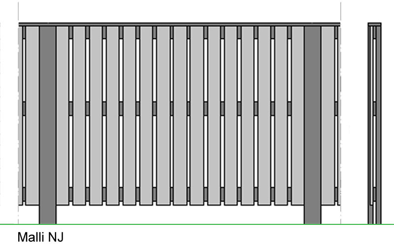 Pystylauta 20 x 98, lautojen väli 20 mm. Vaakalautojen yläreunat viistetty. Korkeudet: 80, 100, 120, 140, 160, 180. Korkeudet 80 cm, 100cm, 120 cm ja 140 cm kahdella vaakalaudalla. Ei vaadi erillisiä tolppia. Elementin pituus 2 m. Etenemä pystytyksessä sama (esim. 5 elementtiä on 10 m aitaa).